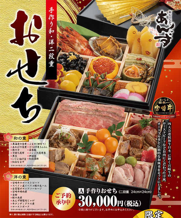 毎年恒例!あんずが作る手作りおせち。 A5ランクの宮崎牛を使ったローストビーフや牛ホホ肉のトマト煮などの「洋の重」と、海老の丸ごと塩焼き・いくら柚子釜などの「和の重」と、お肉を楽しみながらお正月らしさも味わえるバラエティに富んだ内容です。